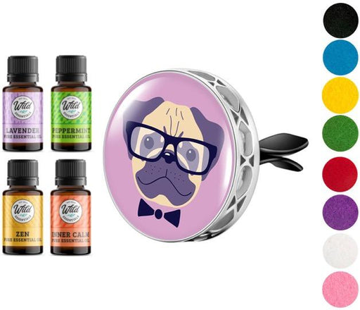 Pug car vent aromatherapy diffuser kit with vent clip, 8 vibrantly colored refill pads and comes with 5ml bottles of lavender, lemongrass, orange s...