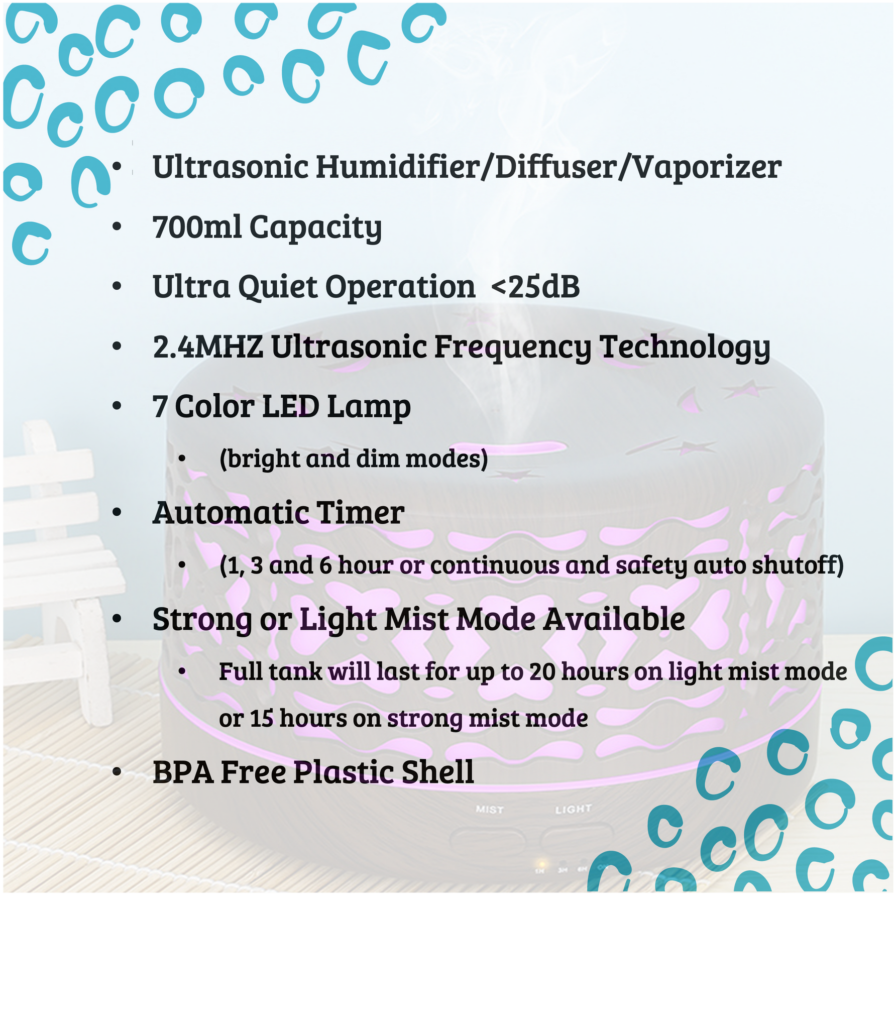 Wild Essentials home diffusers are the perfect solution to diffuse in any size room. Our 700ml diffuser has a light wood finish with a branches design carved into the side of the shell, and moons and stars on the top. Also comes with a remote control, uses AC power and is an aromatherapy/essential oil diffuser, humidifier, vaporizer, air freshener and multi colored nightlight - all in one! Simply fill the water chamber with up to 700ml of water (about 3 cups) and a few drops of your favorite essential oil or fragrance for up to 20 hours of use!