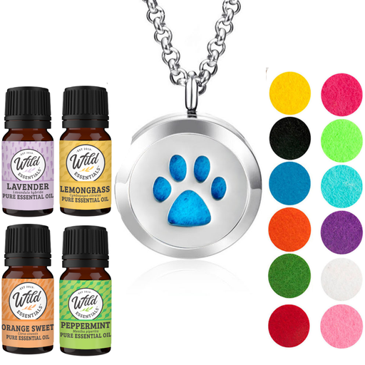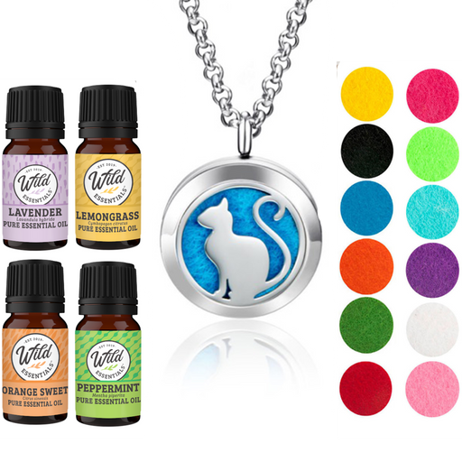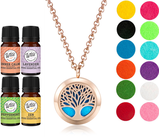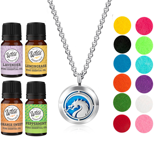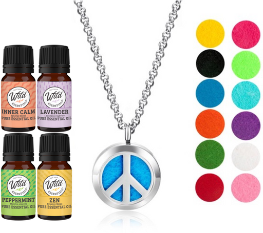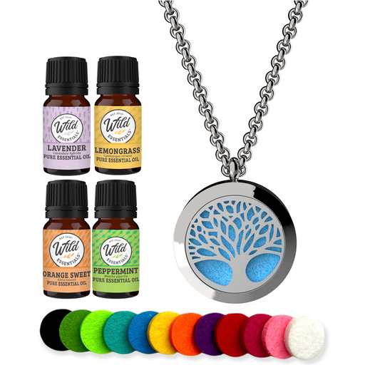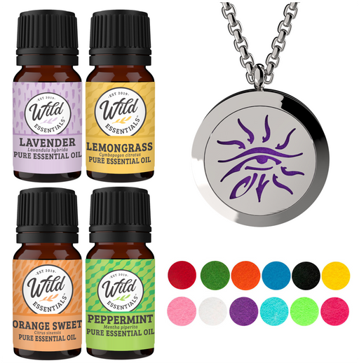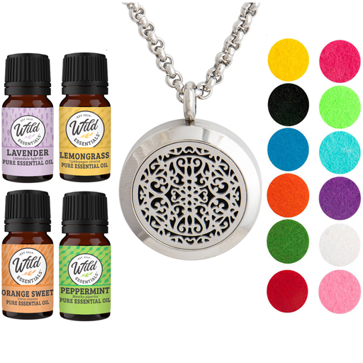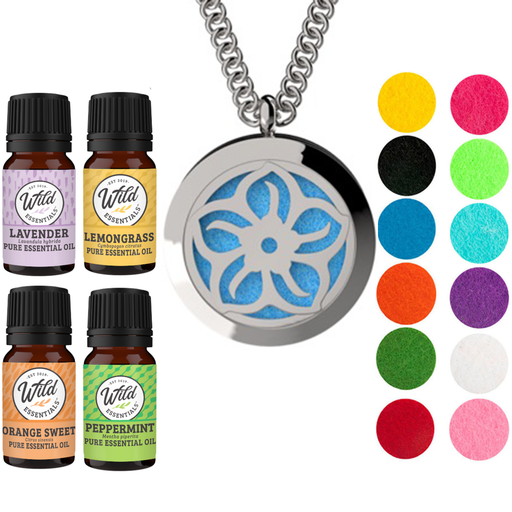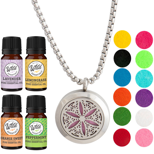 - Wild Essentials stainless steel essential oil necklace diffuser gift sets includes 4 bottles of assorted essential oils and 12 vibrantly colored, premium refill pads.